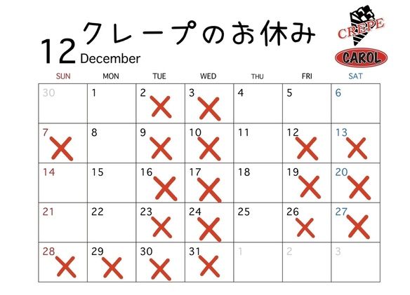 2025年12月の営業カレンダーです。 諸事情により臨時休業等もございますので予めご了承下さい。