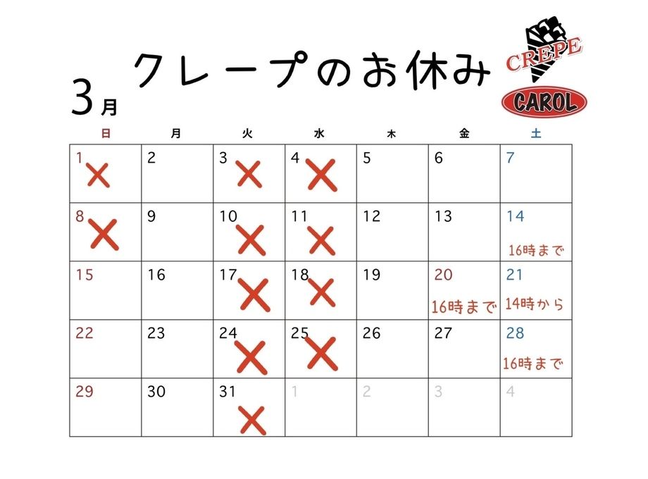 2026年3月の営業カレンダーです。